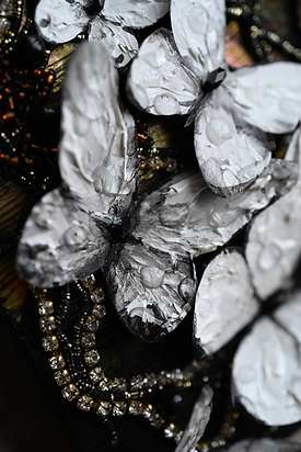 I am driven by a desire to translate my unpredictable mark-making into embroidery, transforming this traditionally controlled medium into something more organic and sculptural. In Chronostasis, I incorporate materials such as metal and amber to achieve this. The butterflies are constructed from paper, acrylic paint, and resin, rather than fabric and thread. A heat-tempered brass sheet forms the central base of the work—a material rarely associated with hand embroidery. Techniques such as beading and couching are present, but primarily serve to enrich the surface texture, challenging conventional perceptions of what textile art can be.