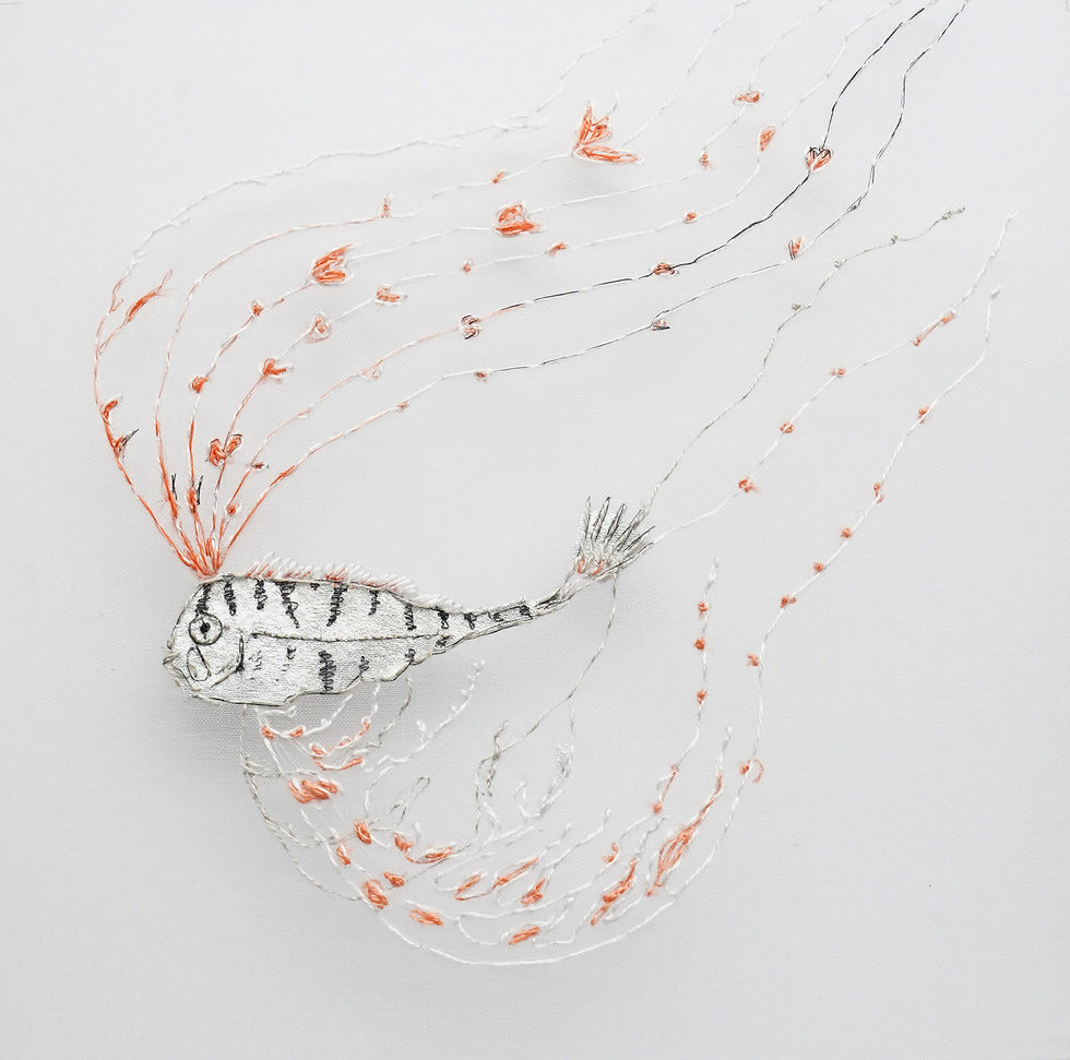 My practice begins with a sense of wonder at the beauty and strangeness of marine life. In the ocean, organisms exist through complex relationships such as mimicry and symbiosis, shaped by the necessity of survival. I am drawn to these quiet yet vital connections. Hand embroidery allows subtle distortions in line and form, creating a sense of movement and life. Fine threads, translucent fabrics, and layered surfaces evoke underwater light, drifting time, and changing perception. Through this slow process, I focus on small marine lives and their ecosystems, inviting viewers to share a moment of attention and immersion.