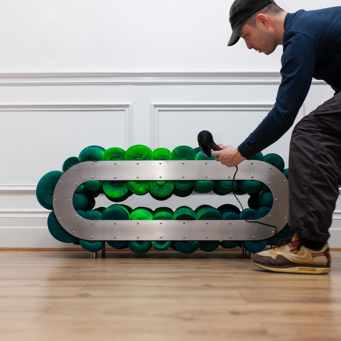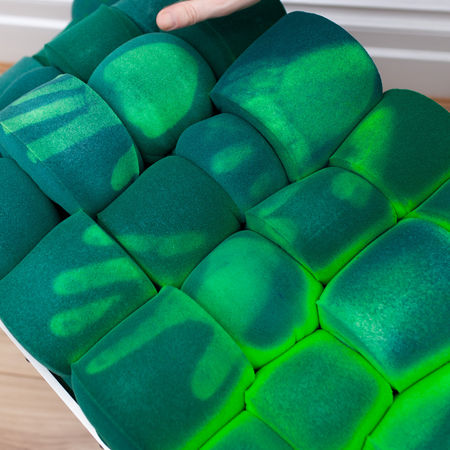 Constructed from reclaimed foam offcuts held within a minimal metal framework, the bench allows discarded material to determine its own form, resisting standardised design logic. Rather than concealing its internal structure, the work exposes compression, density, and irregularity as a visible record of past use and transformation.