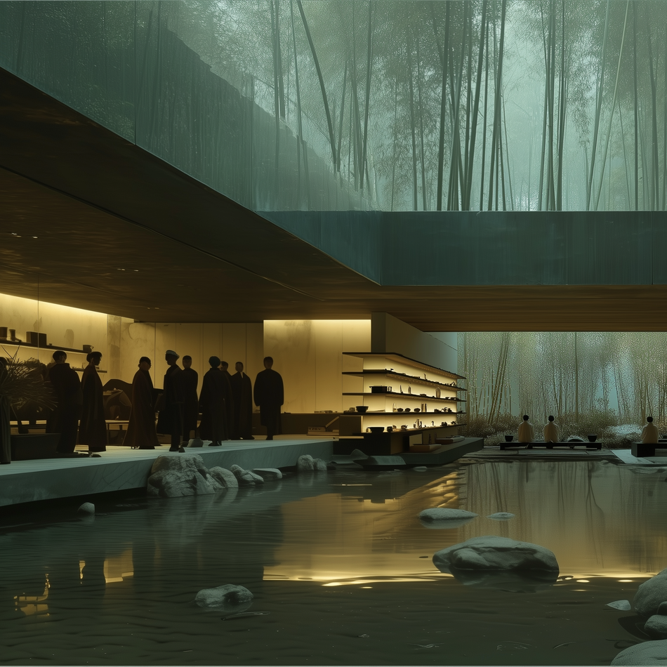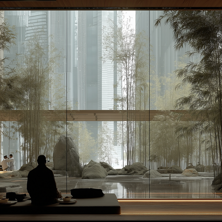 Part II, ‘Imagine a Tea House for an Ideal World’: AI generative design iterates a glass-tile roof and laminated-bamboo envelope; outputs are rendered at 24 fps and composited into Sora video loops.Part III, ‘Haven in the Concrete Grove’, slips that pavilion between towers, its soft glow a breathing pause in the city’s sentence. Together, the trilogy asks how architecture can gift calm, ritual, and connection inside the concrete rush.