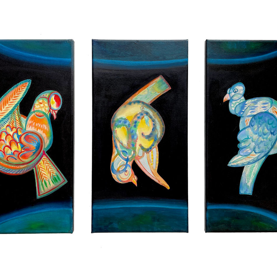 The inspiration for the frame comes from the windows and mirrors of the residence during the period of living in Paris.where pigeons—symbolising human society—serve as a recurring motif of the mundane. The initial draft was created in watercolor, blending traditional Chinese ethnic motifs with gradient hues. It was later reimagined in oil paint on canvas, with the background palette symbolizing the unknown cosmos and my longing for family back in China. The triptych frame, modeled and 3D-printed, is inspired by the gilded mirror frame in my Parisian living room—a form of daily self-reflection. The reverse side features a mirrored finish, echoing the interplay of introspection and connection.