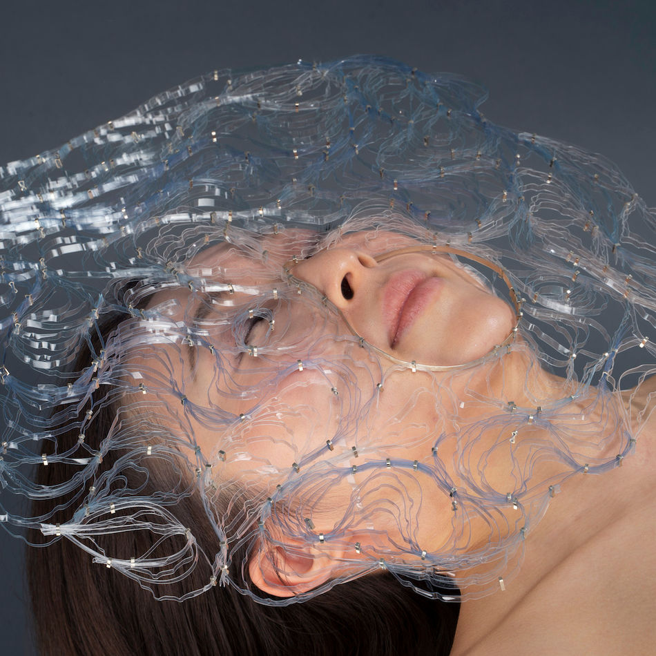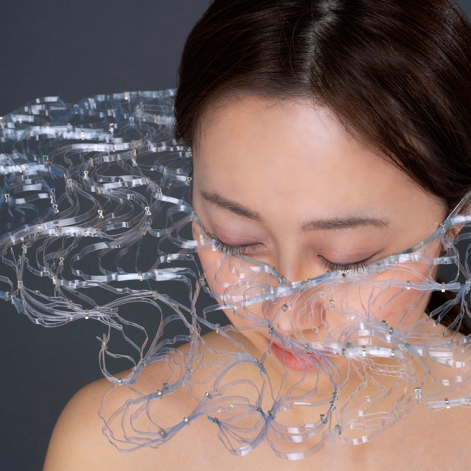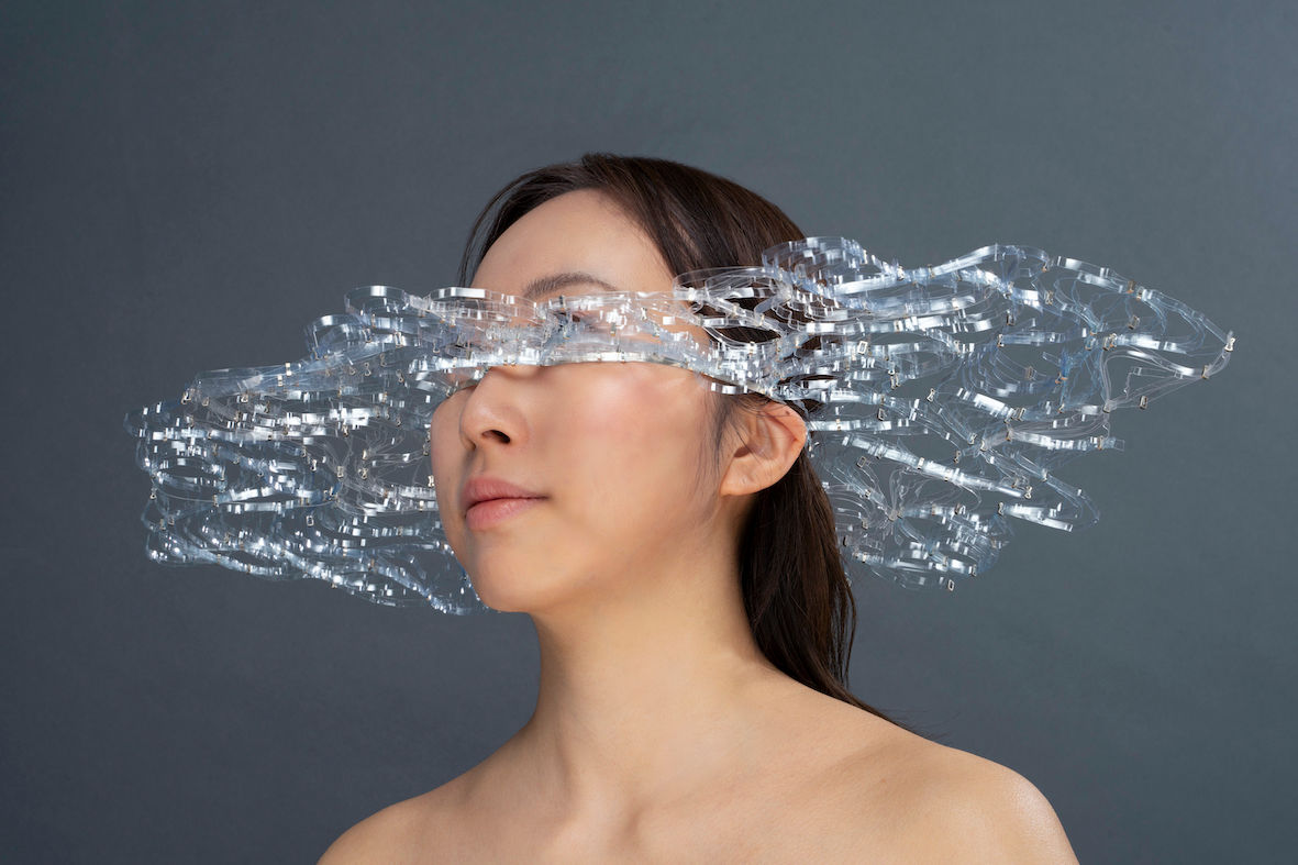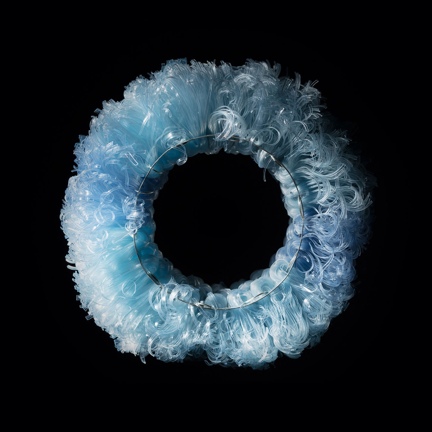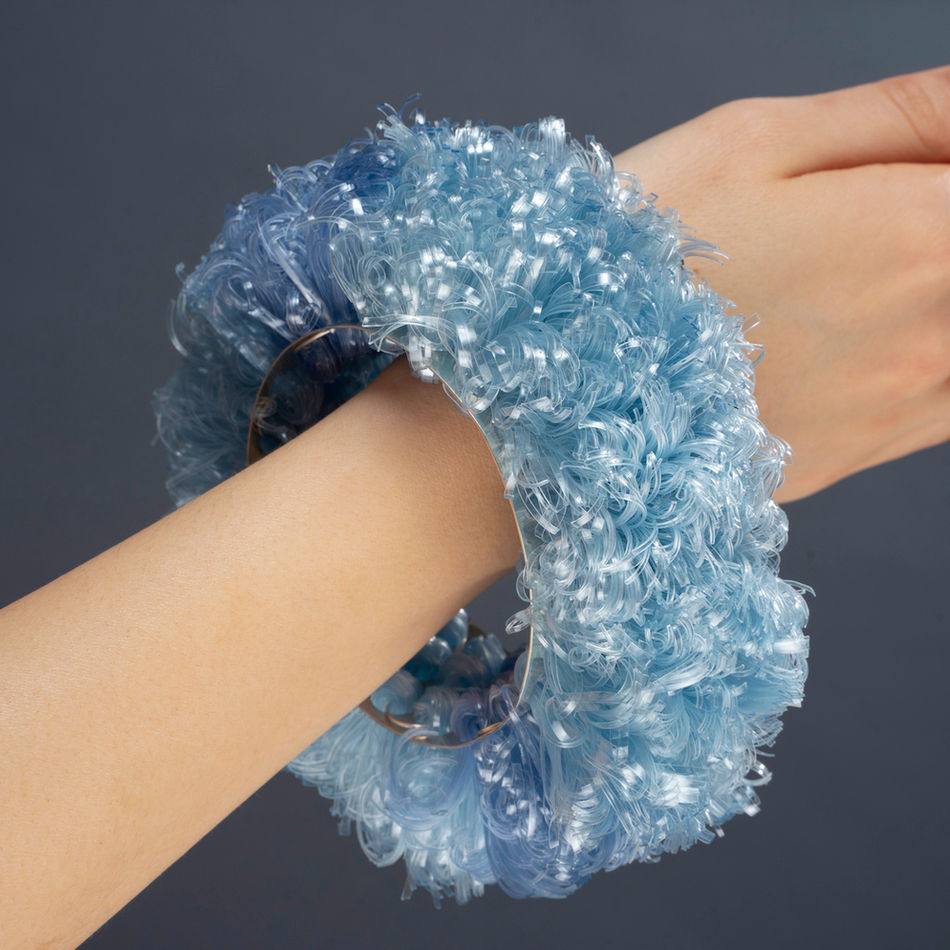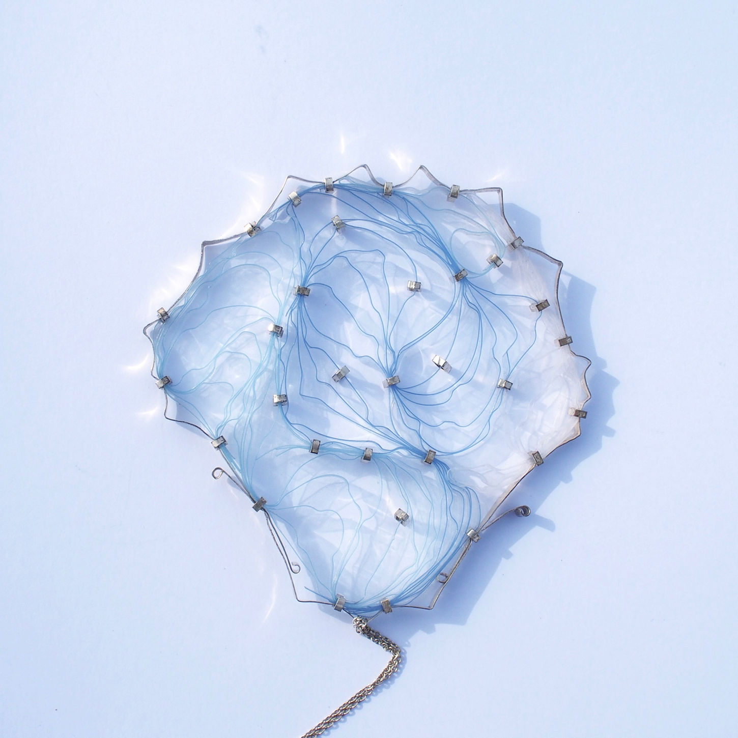 bad, but our lack of responsibility to ensure plastics don’t end up in almost all our oceans where the damage is great. One day, I saw a plastic bottle literally in a new light. Sitting next to a window and through the sunlight, suddenly I was fascinated by the cleanliness, transparency and reflection of the plastic. Looking again at plastic bottles encouraged me to treat it as a precious material. Inspired by the great oceans of the world, I am exploring the energy of ocean waves and poetic beauty of water around the body to propose a new perspective on a material that is damaging our water environment. I wanted to bring awareness to the subtle beauty of plastic bottles for jewellery, and at the same time, to bring thoughts to the clean water which still can be saved if we change our action.
