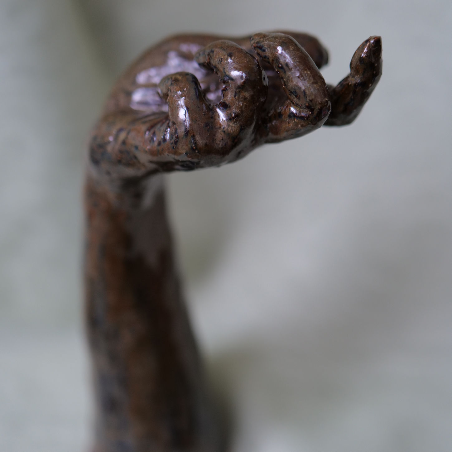 Recurring across the collection are feminine forms, faces, and hands; used to explore ideas of vulnerability, transformation, and emotional presence. Surfaces are finished with oxide stains, glaze, or left raw and sanded to reveal the marbled clay beneath. These works reflect a process-led approach: tactile, expressive, and rooted in material connection.