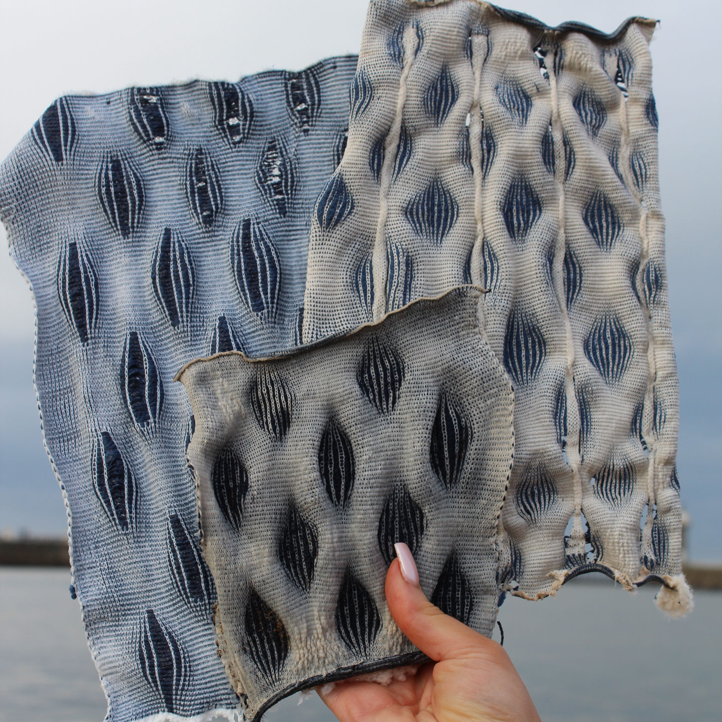 My work pushes the boundaries of knitted textiles using unconventional materials and methods to push sustainable innovation. Research into recycled fishing line fibres and PP yarn informed my artistic decisions, looking to reduce the amount of waste that ends up in landfill and our oceans to protect wildlife and our futures. The use of sea glass within my work captures Earth's natural ability to turn rubbish into something beautiful. A once discarded bottle ends up in the sea, which then churns it up, breaks it, and returns the pieces to shore- smooth and shining. Through using these pieces of ‘beautiful rubbish’ within my work I wish to shine light onto how we can reimagine man-made materials through innovative redesign solutions.