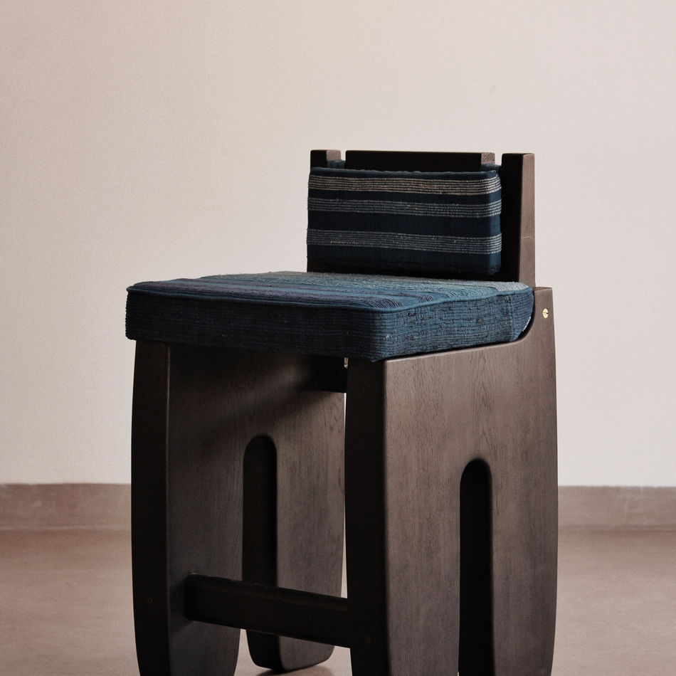 The stool draws from the weighted presence of Indian vernacular furniture, foregrounding the hand over machine-led precision. Its density resists disposability, asking us to reconsider permanence and value. The upholstery, developed by Iro Iro, is handwoven from pre-consumer offcuts, deadstock and other non-virgin materials from fashion’s excess, dyed naturally. By revealing the time, skill, and afterlives embedded in wood and cloth, the piece reflects the collection’s commitment to material continuity and renewal.