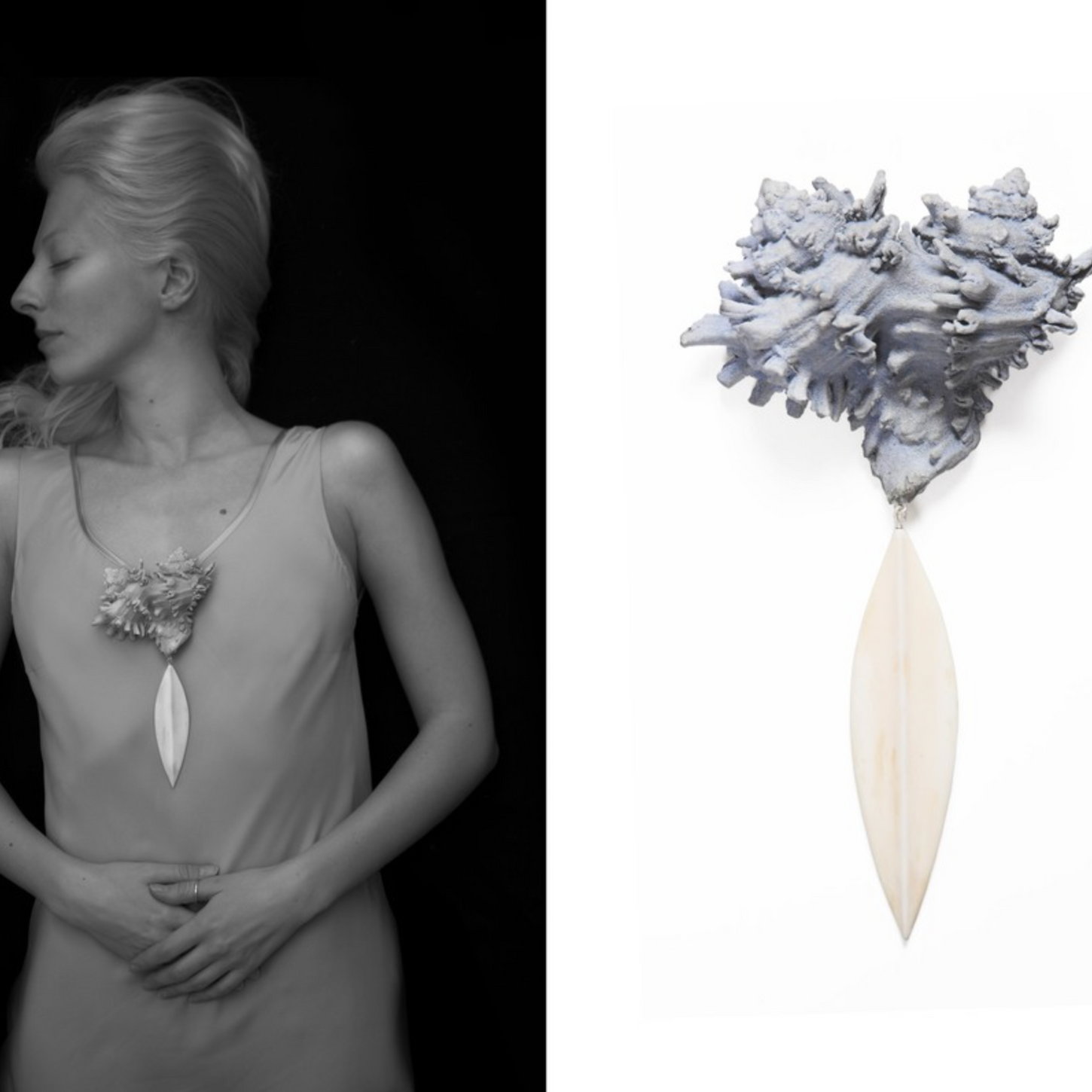 Veenre likes to combine metal with such a natural details like rope or coal (back to the Stone Age?). He makes historical collars out of shining fish-scales, which he strings together with little glass beads. As a result his work looks very fine with its dynamics, femininity and grace. It is experimental and theatrical, there is a fine sense of drama inside